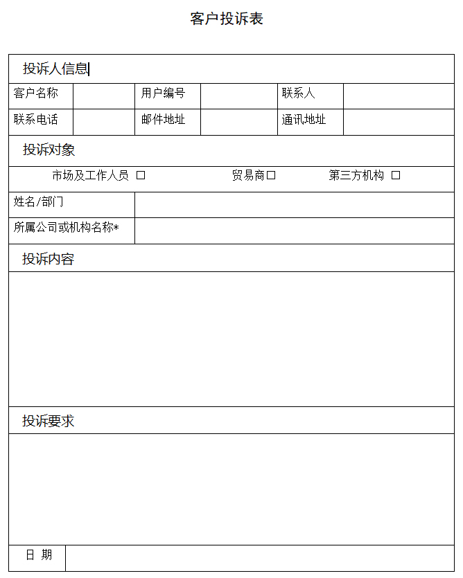 三.投诉的范围为(1) 针对贸易商和第三方机构及其工作人员的违约违规行为或服务质量问题;(2)针对本市场及其工作人员的服务质量问题或系统问题,但不包括本市场系统直接进行判罚的贸易商交收违约情形以及贸易商可以通过本市场系统线上提出的交收异议的情形(如仓单异议、开票异议、发票异议等)。